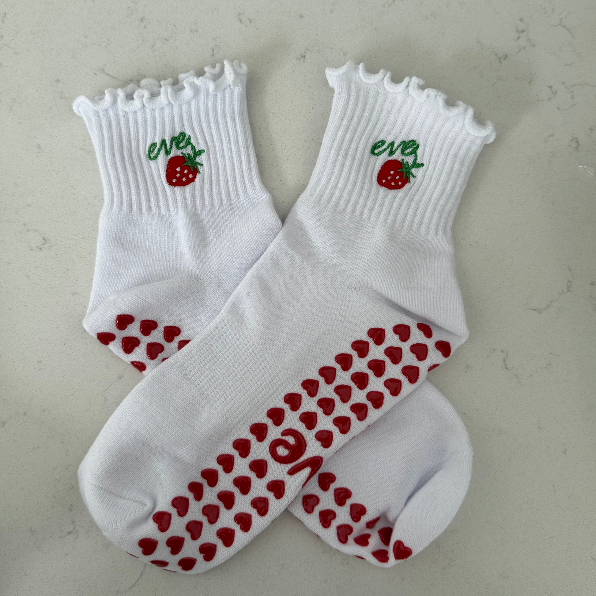 Bring a little sweetness to your workout with our Strawberry Sweet socks. Featuring a dainty strawberry embroidery with the signature “eve” detail, a frilly white ruffle edge, and heart-shaped red grips for extra traction, these socks are as cute as they are functional. Designed for Pilates, barre, and beyond, they’re your go-to for playful studio style and serious grip support.
